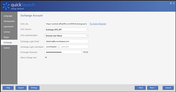 - EWS Version is important and Quicklaunch may not connect if the correct version is not selected.