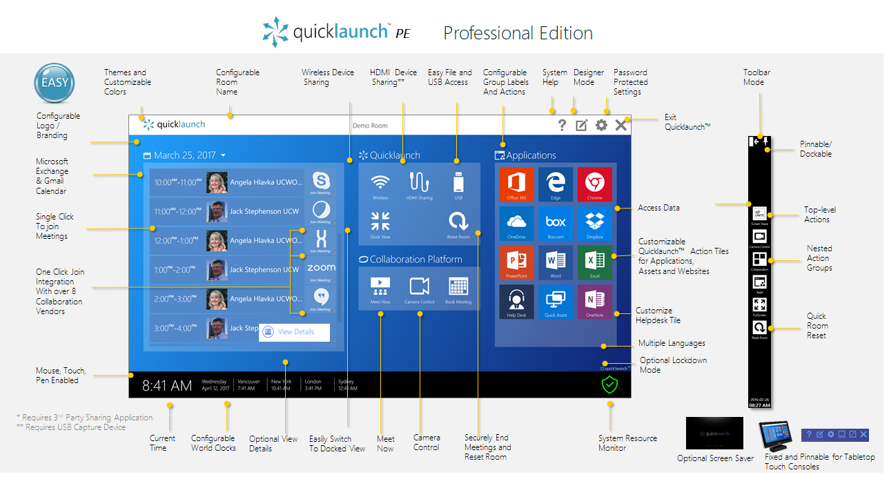 - IF the meeting room is to be configured in Lockdown Mode there are two options. Either the “Meeting Room" account has local administration rights on the target machine OR Lockdown Manager is installed and configured to support Lockdown Mode with a local User account (this machine MUST be a dedicated Quicklaunch Kiosk - See How to install Quicklaunch to a local User account for more details).