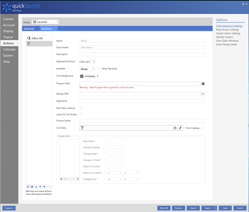 Select Display, Select - Fullscreen add the display(s) where you want Quicklaunch to run