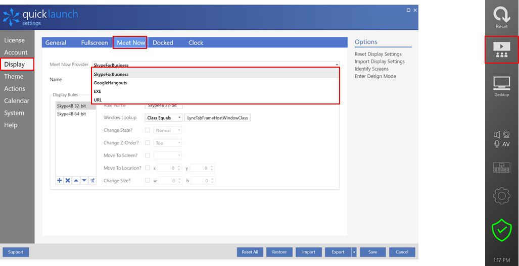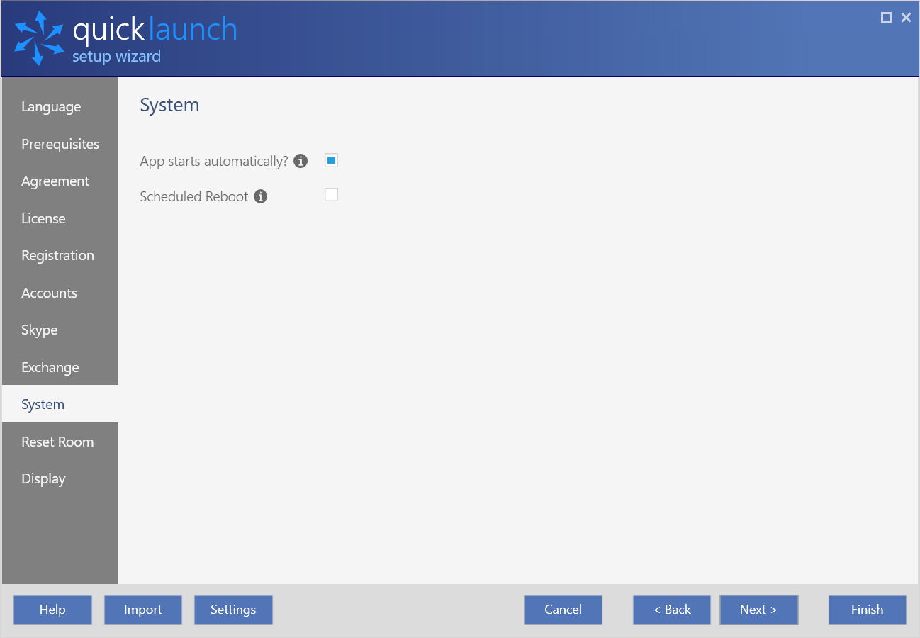 - If Quicklaunch is to be restarted on reboot the Meeting Room account on the target machine will need to be configured to log on automatically; and Auto Start will need to be turned on in Quicklaunch System Settings.