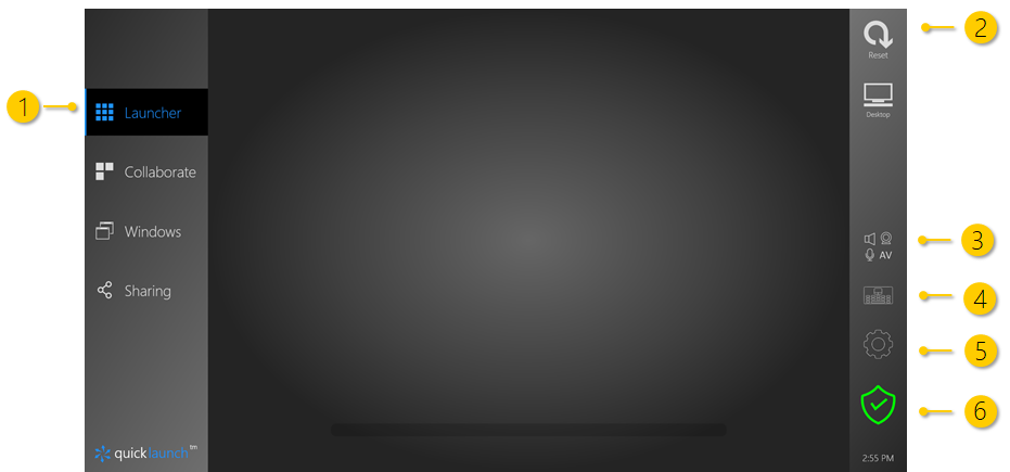 Reset Room on Meeting End? – If a scheduled meeting ends, Quicklaunch™ will prompt to reset the room once the meeting schedule passes. If you do not respond before the timer expires, the room is automatically reset.