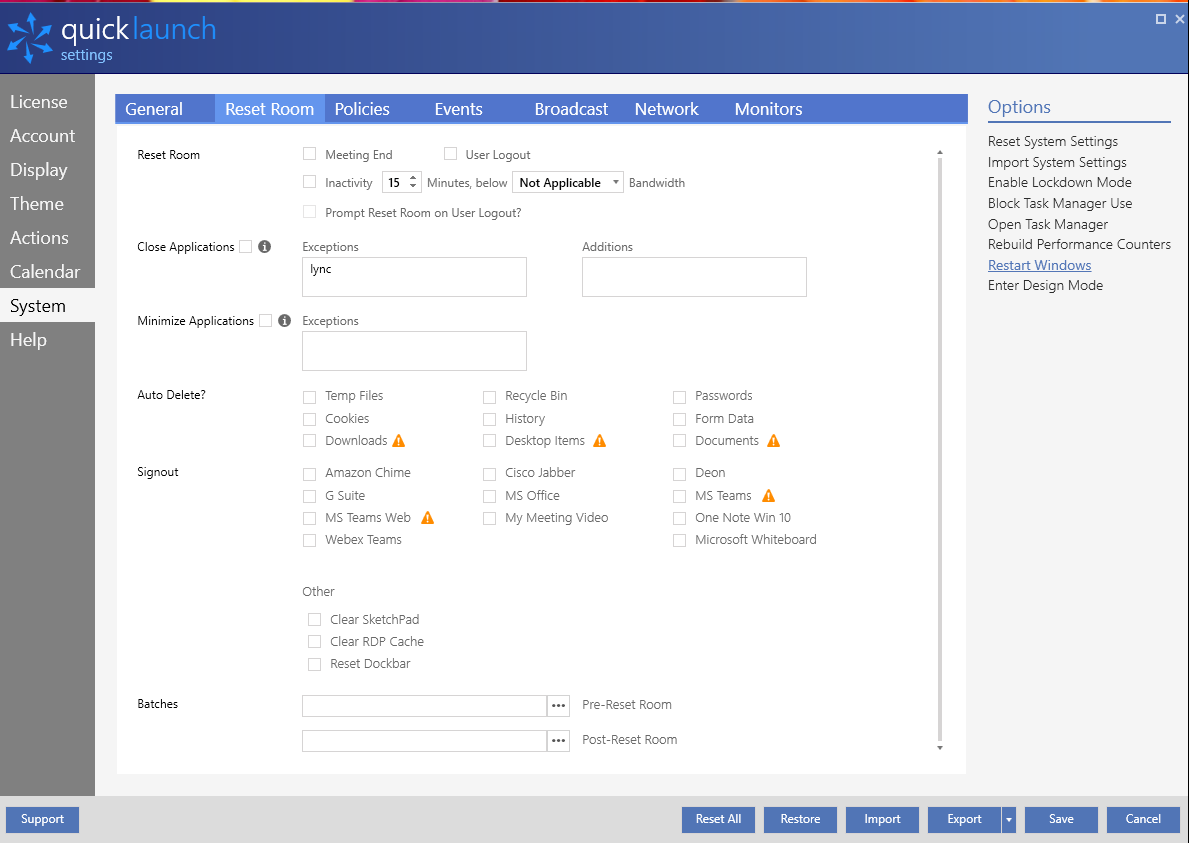 Room Reset and Lockdown Mode Provide Peace and Mind for IT and End Users. Room Reset provides the ability to log out of all applications, delete files, and close applications at the ends of meetings.