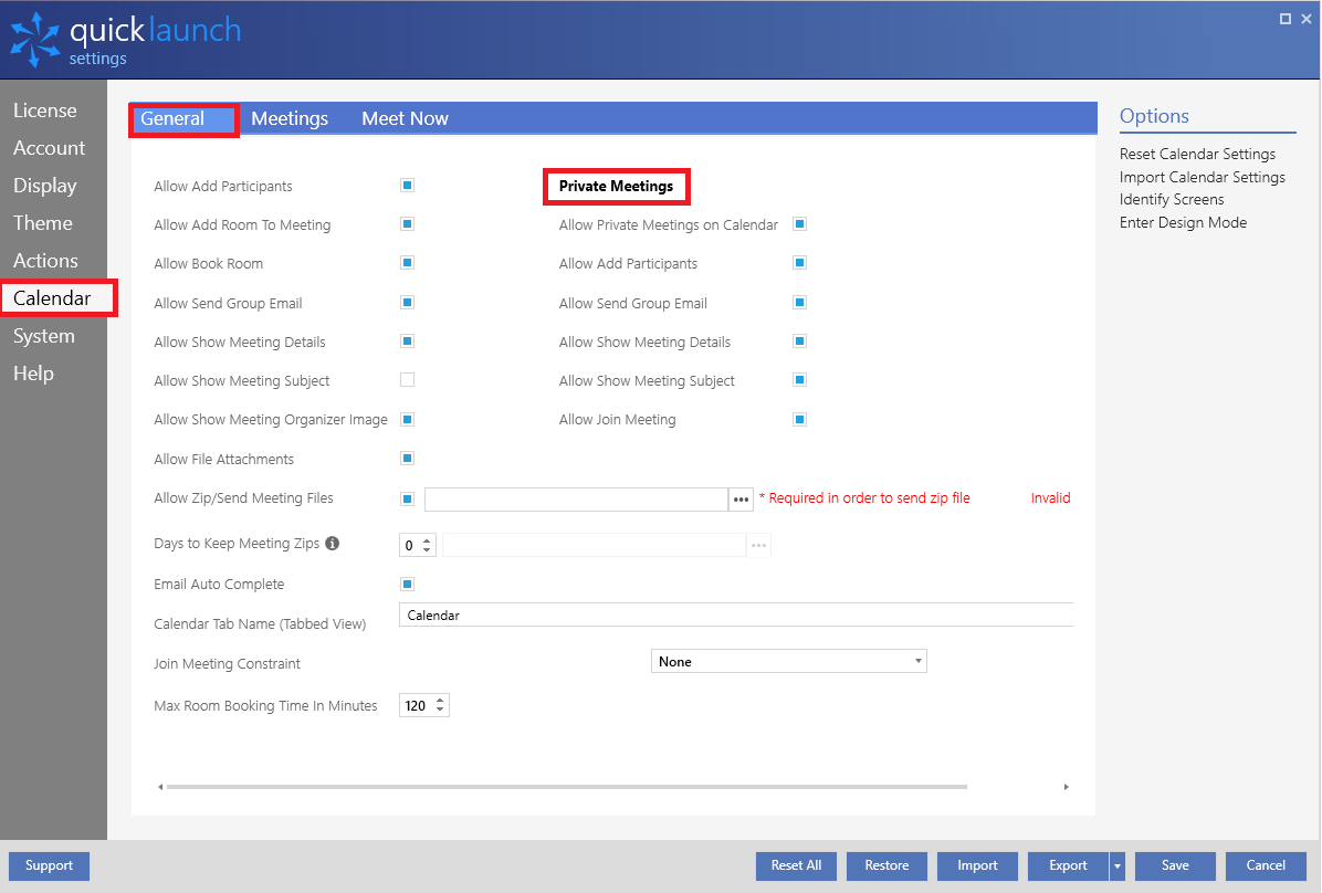 - Allow Private Meetings on Calendar: If you enable this setting, Private meetings will show on you Quicklaunch Calendar.