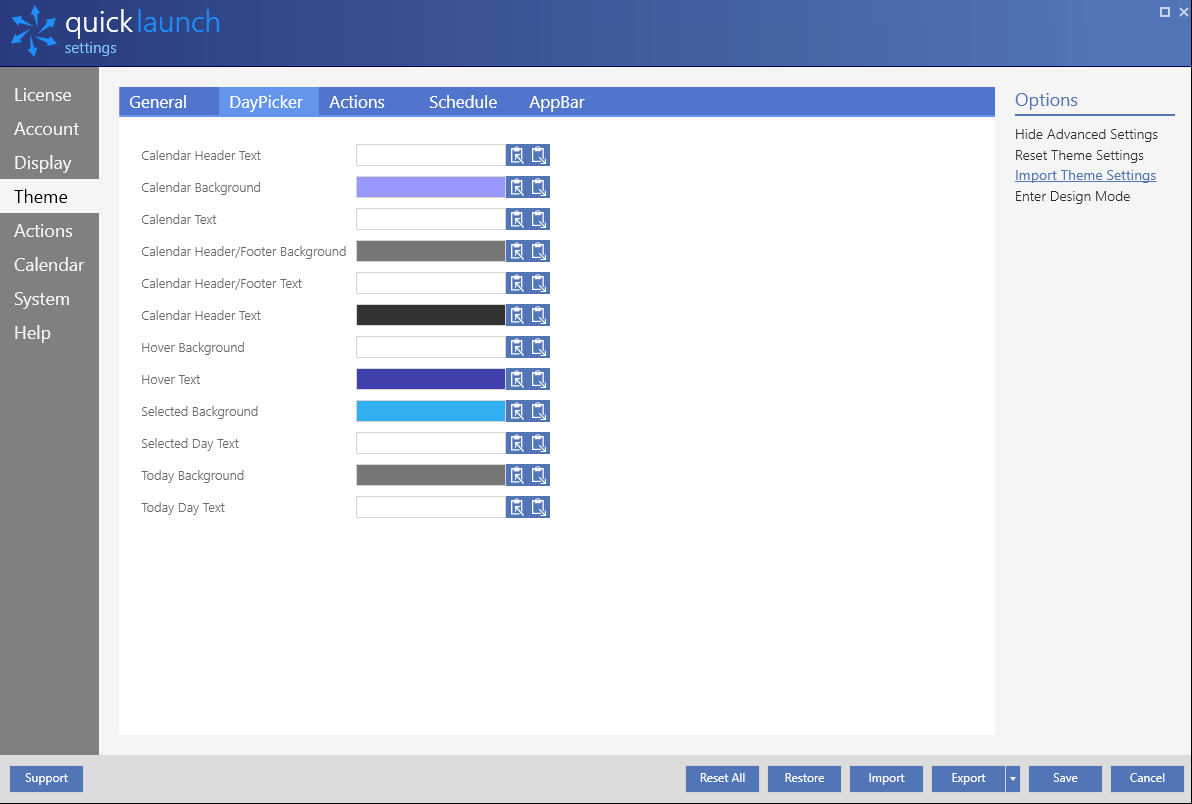 Color Picker settings allow you to customize the color theme of Quicklaunch.