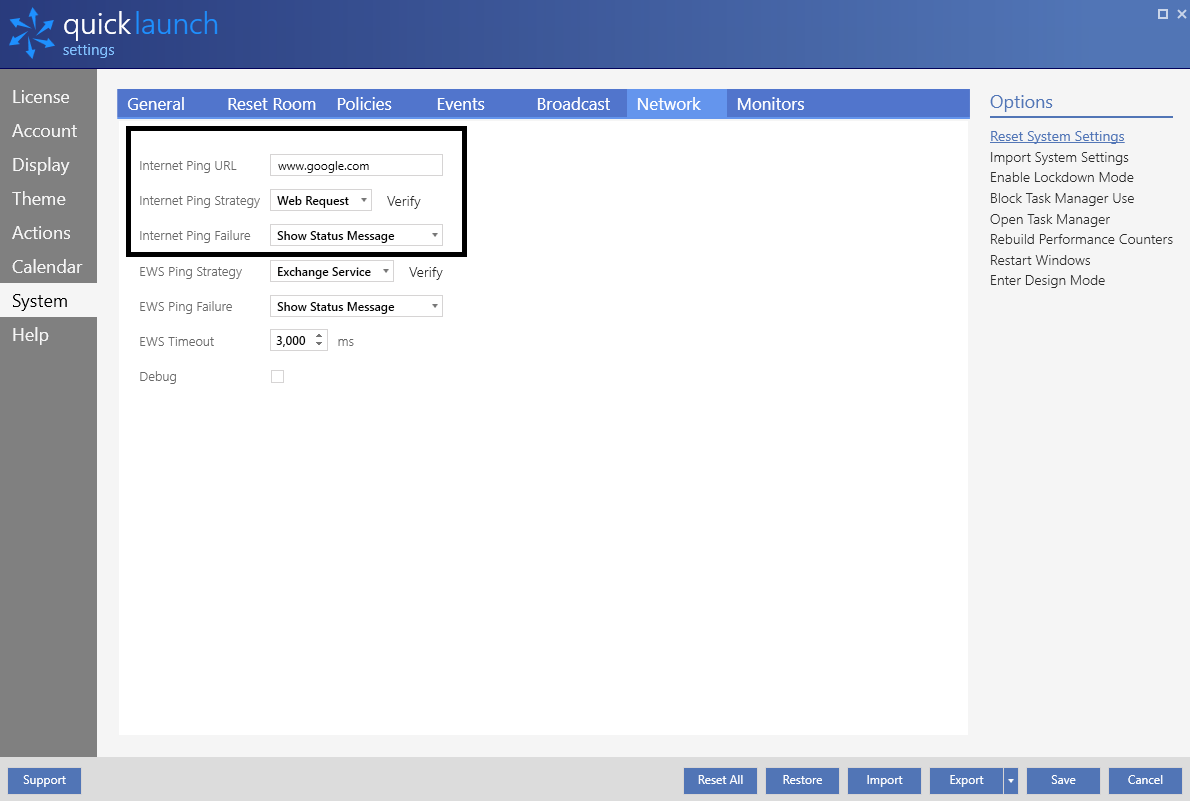 - Debug: This Setting is for system diagnosis - as directed by Quicklaunch technical support. Please, leave this unchecked unless instructed to enable.